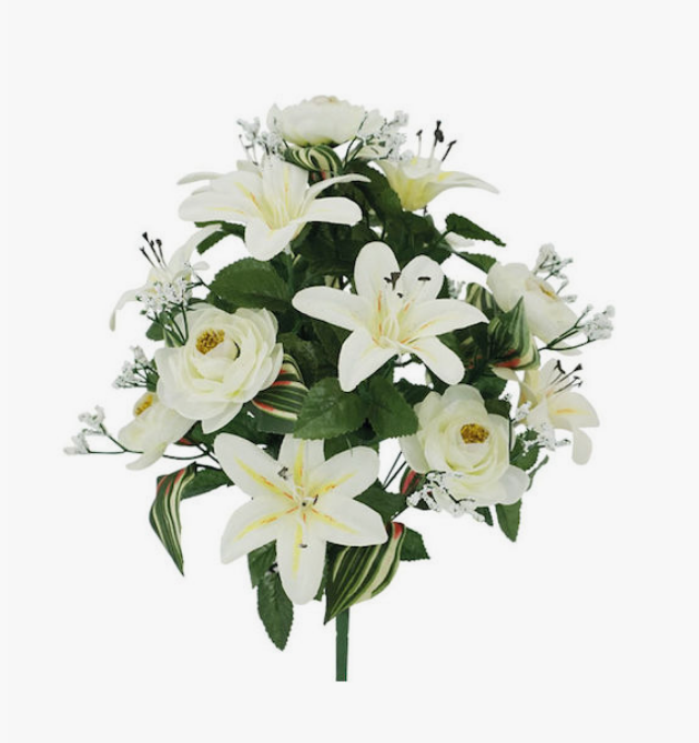 Artificial ecru bouquet in two shades of neroli and lilies with green foliage.