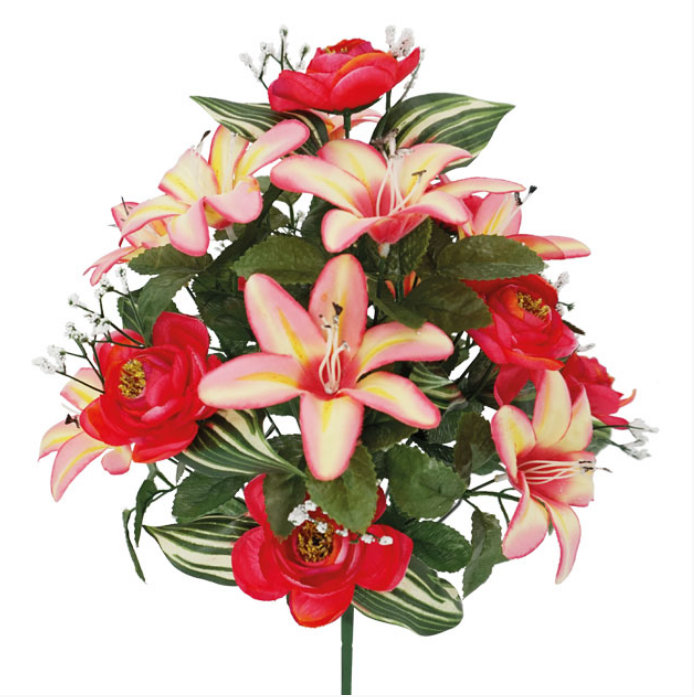 Artificial bouquet of red in two shades of nasturtiums and lilies with green foliage.