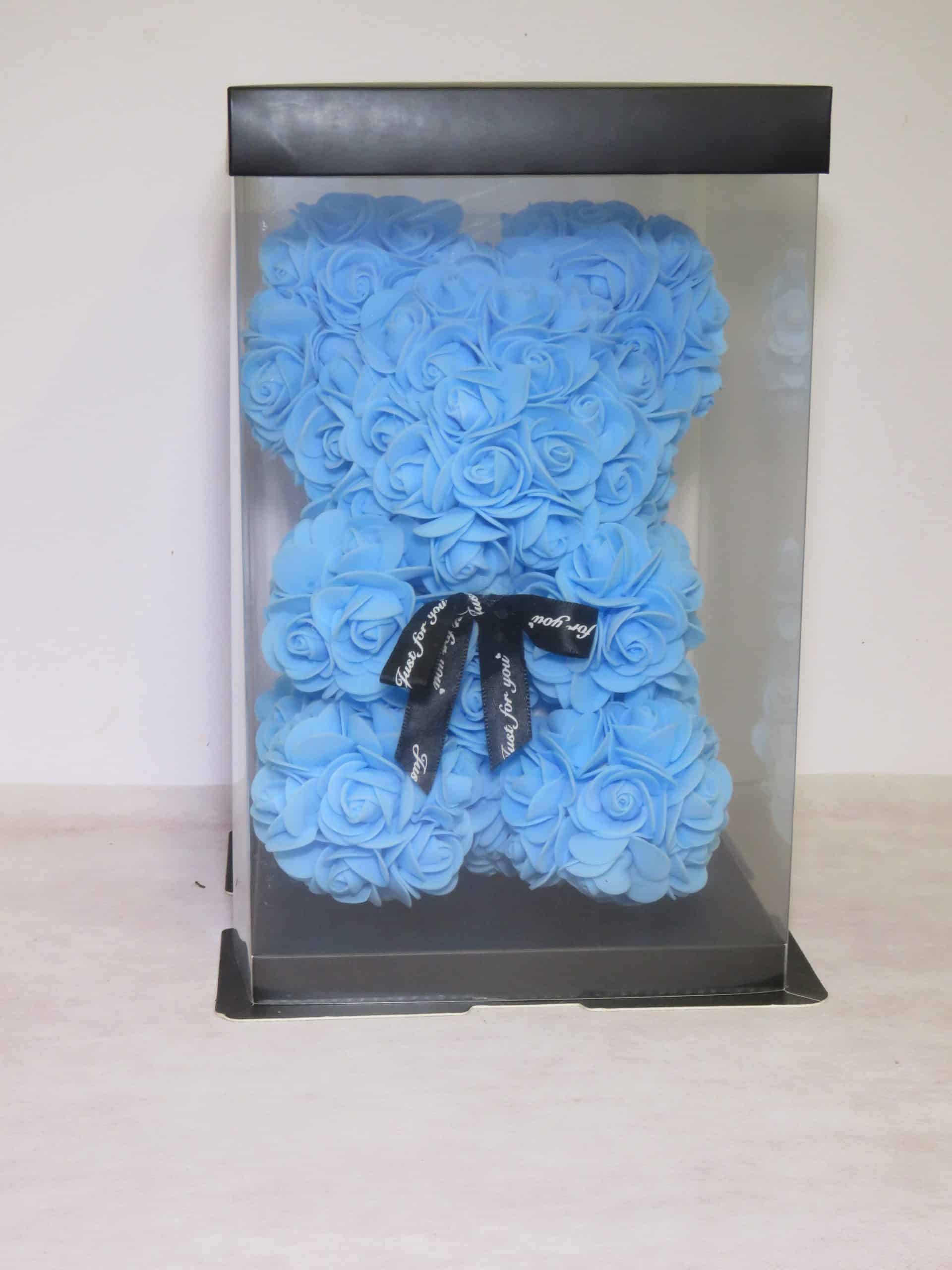 Rose Bear με Γαλάζια τεχνητά τριαντάφυλλα σε κουτί δώρου πολυτελείας. -Τα τριαντάφυλλα είναι τεχνητά, με μαλακή υφή. Ένα δώρο, με μεγάλη διάρκεια ζωής.