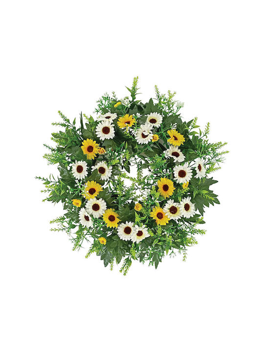 Τεχνητό στεφάνι από εκρού και κίτρινες μαργαρίτες με πράσινο φύλλωμα.