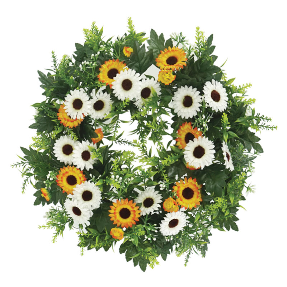 Τεχνητό στεφάνι από εκρού και πορτοκαλί μαργαρίτες με πράσινο φύλλωμα.